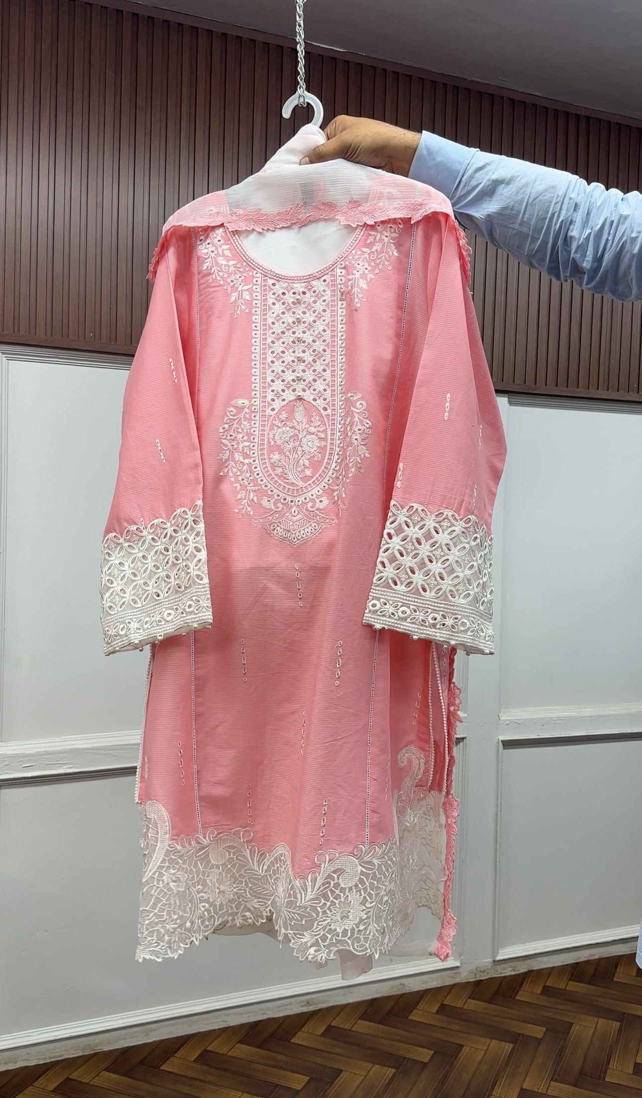 Elevate your style with this stunning 3-piece dress featuring exquisite embroidery and delicate cutwork on a premium cotton shirt and trouser. The set is paired with a soft chiffon dupatta, also adorned with matching embroidery and cutwork detailing for a graceful finish. Part of Ayesha.B’s Luxury Collection, this outfit blends elegance, comfort, and timeless craftsmanship — perfect for festive gatherings or special occasions.