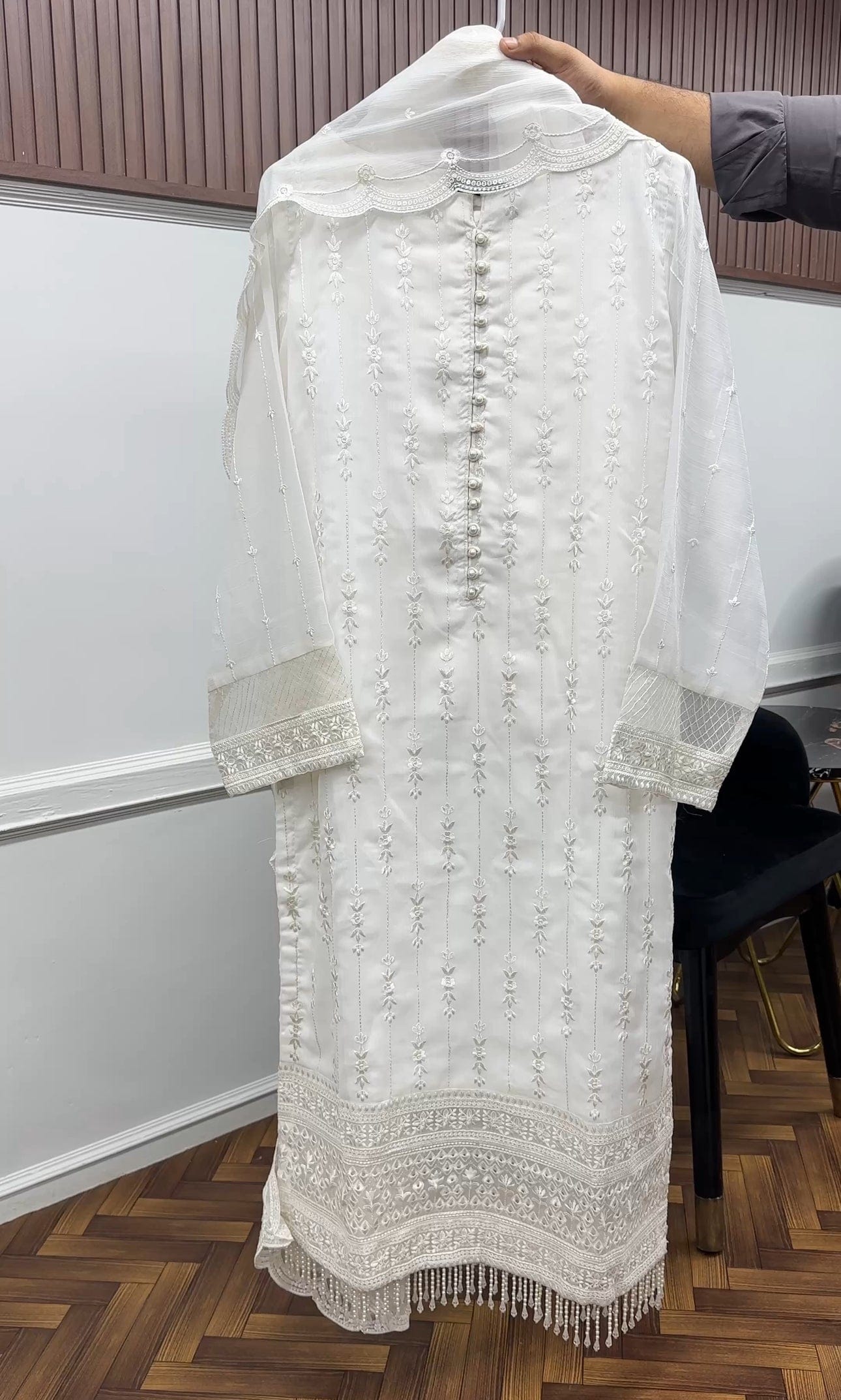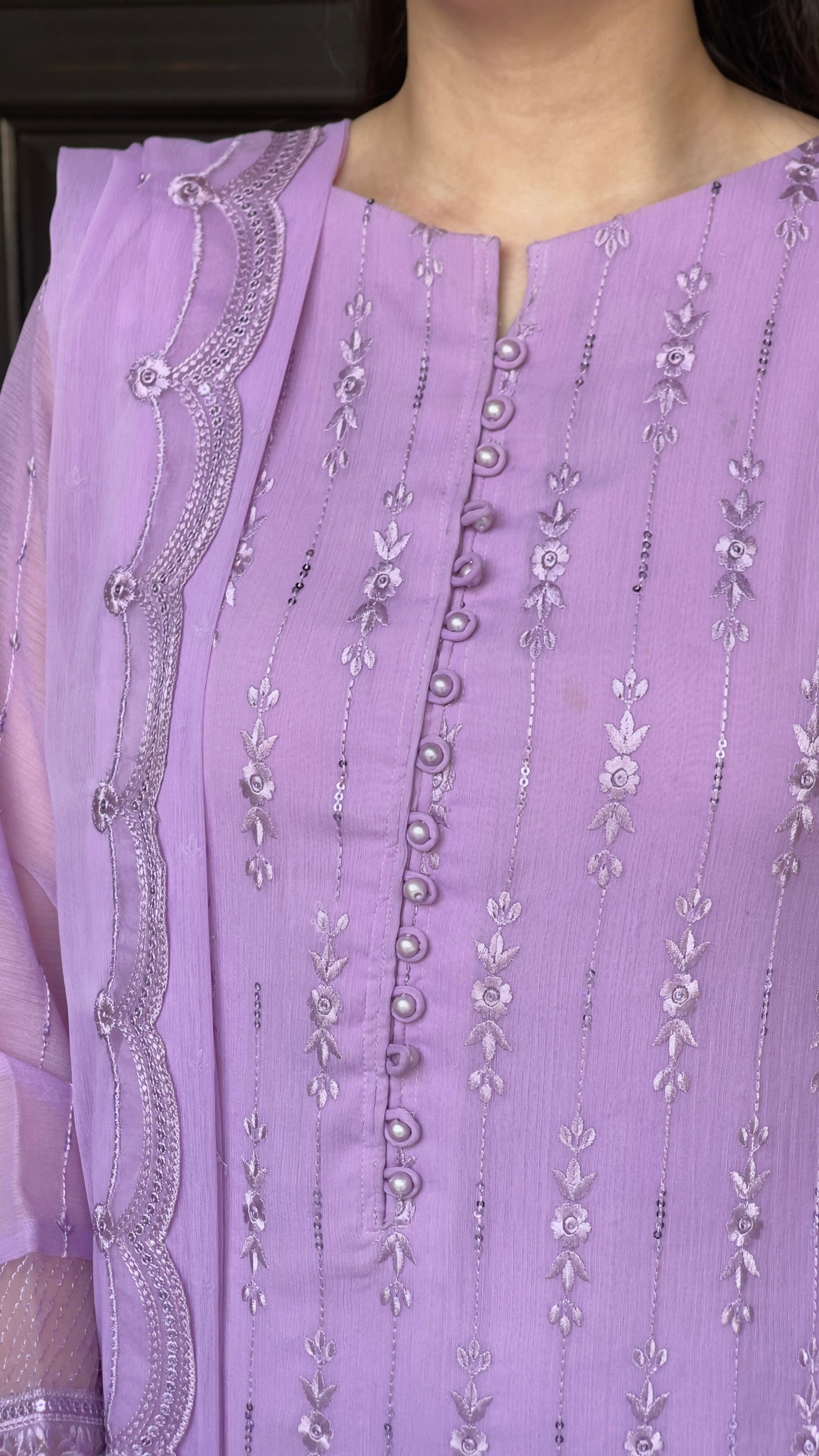 Elevate your wardrobe with this premium chiffon 3-piece suit by Ayesha.B. Crafted from soft chiffon fabric, it features delicate embroidery, a beautifully stitched shirt, matching trousers, and a flowy chiffon dupatta. Perfect for festive events and formal gatherings, this luxury piece blends elegance with comfort.
