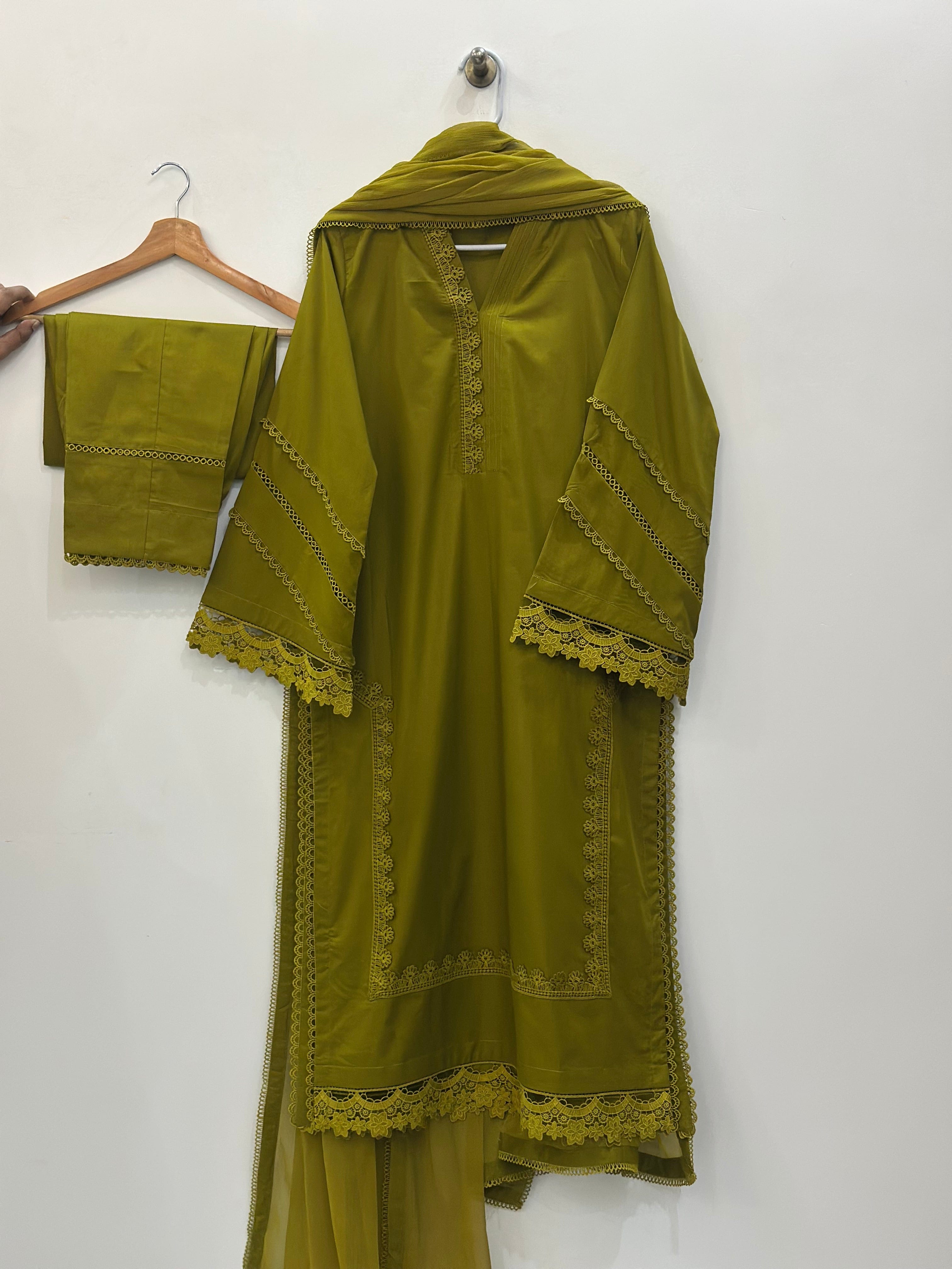 Khaddar comfort, lace luxury. This Ayesha.B 3-piece set is all about effortless grace ✨💗